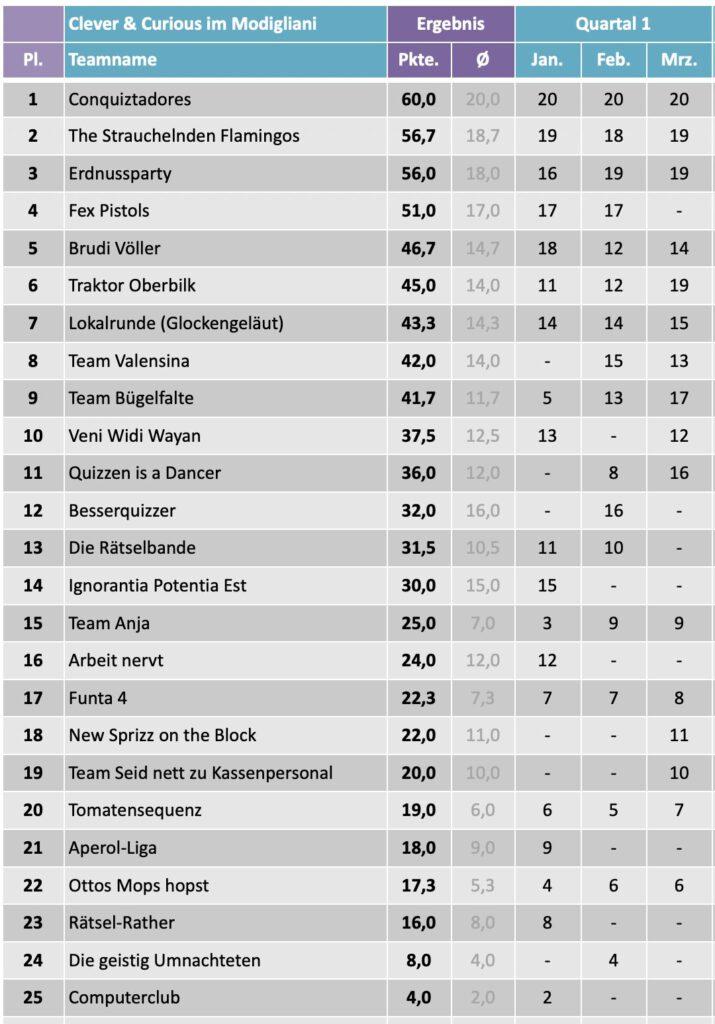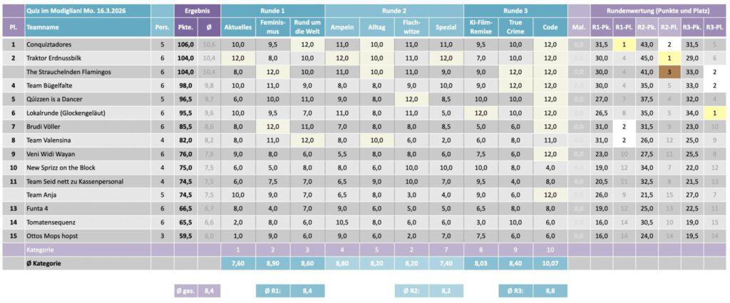 Hier kommt die Tabelle des letzten Quiz. Bitte bedenkt, dass die Ergebnisse der verschiedenen Locations untereinander nicht vergleichbar sind, da ich Fragen teilweise verändere oder ersetze und außerdem mal mehr oder weniger Tipps geben.